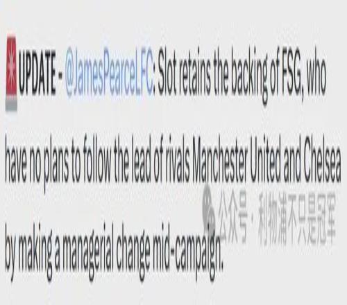 在如此沮喪的結(jié)果面前,終場哨響時,安菲爾德也噓聲四起。沒有人會對這樣的結(jié)果滿意,但網(wǎng)媒競技(TA)跟隊記者皮爾斯賽后透露,芬威依然支持斯洛特,他們并沒有計劃像曼聯(lián)和切爾西那樣,在賽季中途更換主教練。
